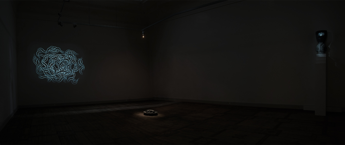 Sculptures regardant comme Janus dans deux directions, dessins à double lecture, projections sont autant de reflets des doutes et des interrogations de l'artiste face à une société en pleine mutation. Avec un certain humour pour prendre de la distance.