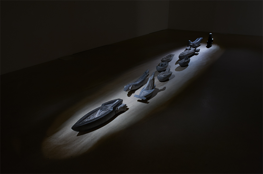 - Une histoire de roseaux et de tortue, sculptures et reliefs, pierre de Soignies et béton, Fondation du Levant, Lausanne