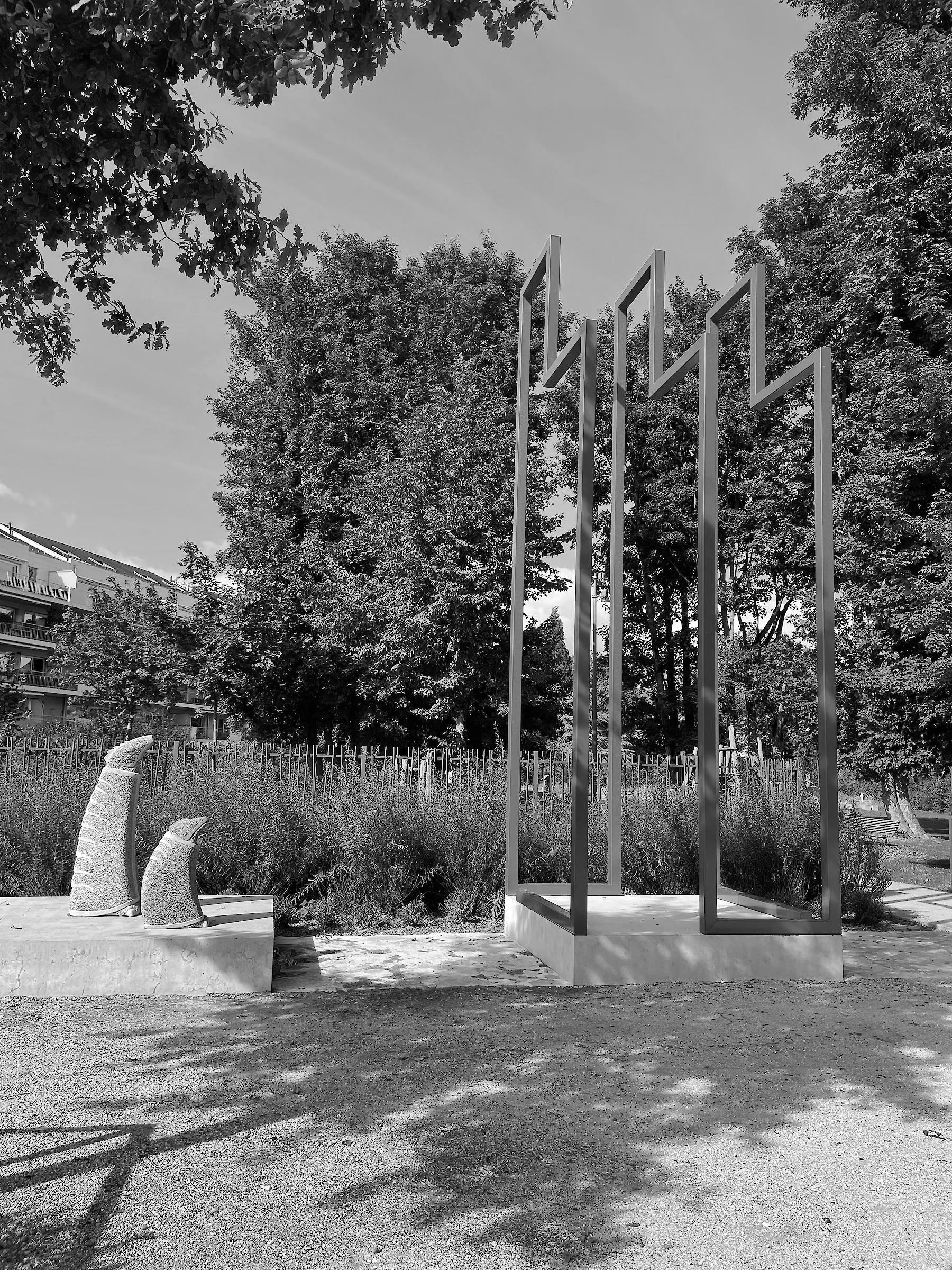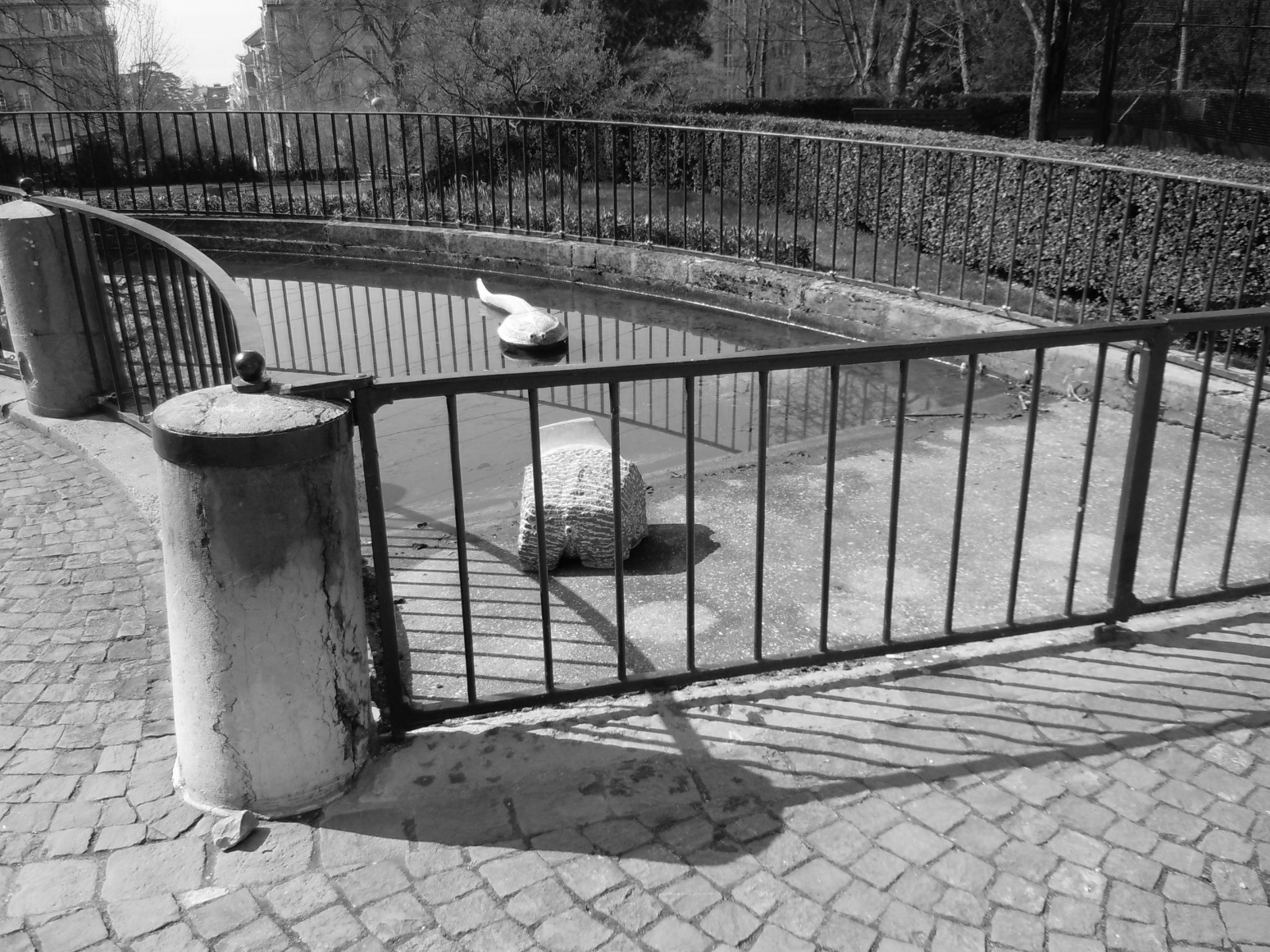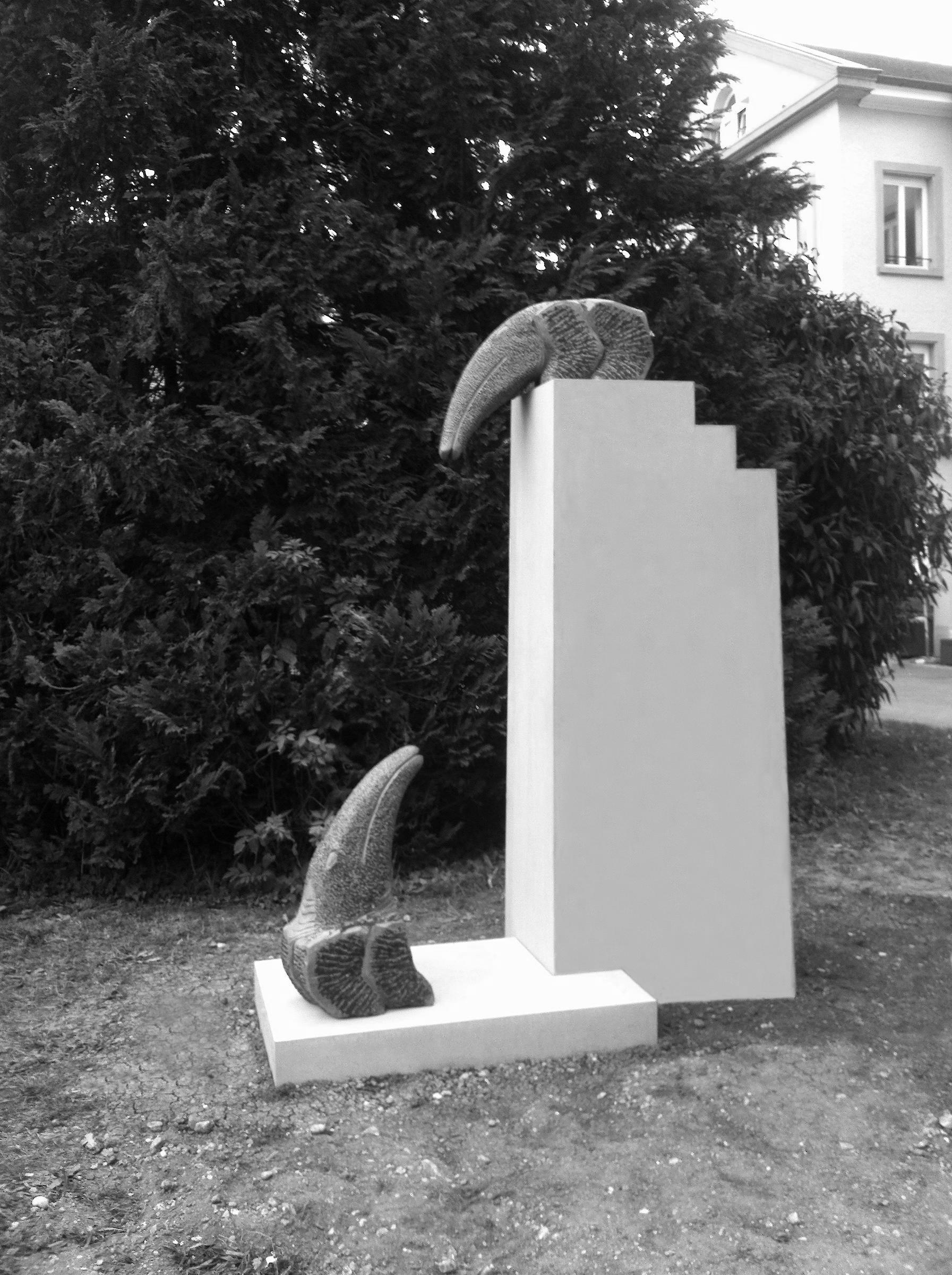 - Tentative pour s'envoler, sculpture, calcaire de Pouillenay et béton, Parc de l'Ile heureuse, La-Tour-de-Peilz