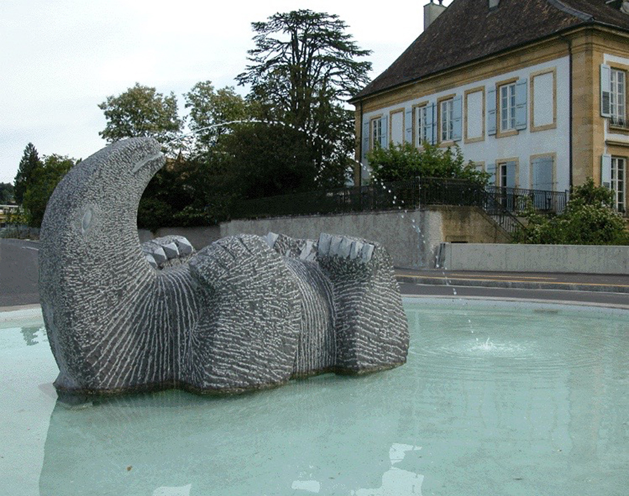 - Heaume-bouclier, sculpture et bassins, marbre Duquesa, La Suisse-Assurances, av. du Théatre, Lausanne (démontée)
