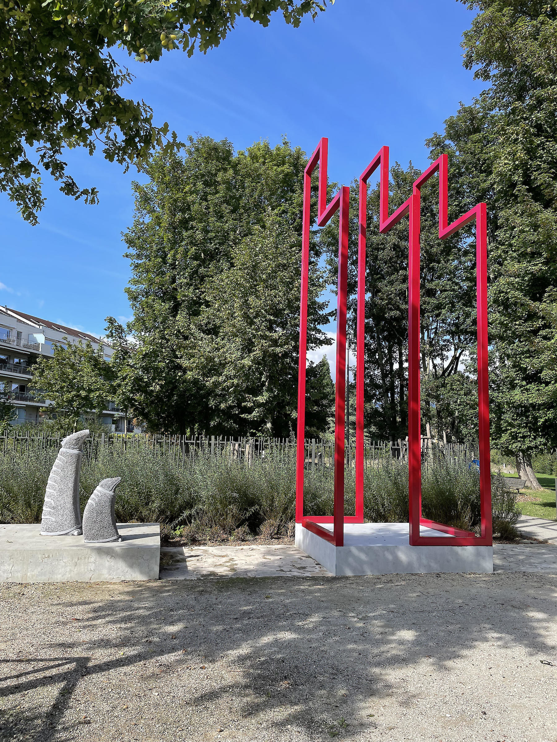 Conjecture, pierre de Soignies et acier inox rouge, Parc du Castrum, Yverdon-les-Bains