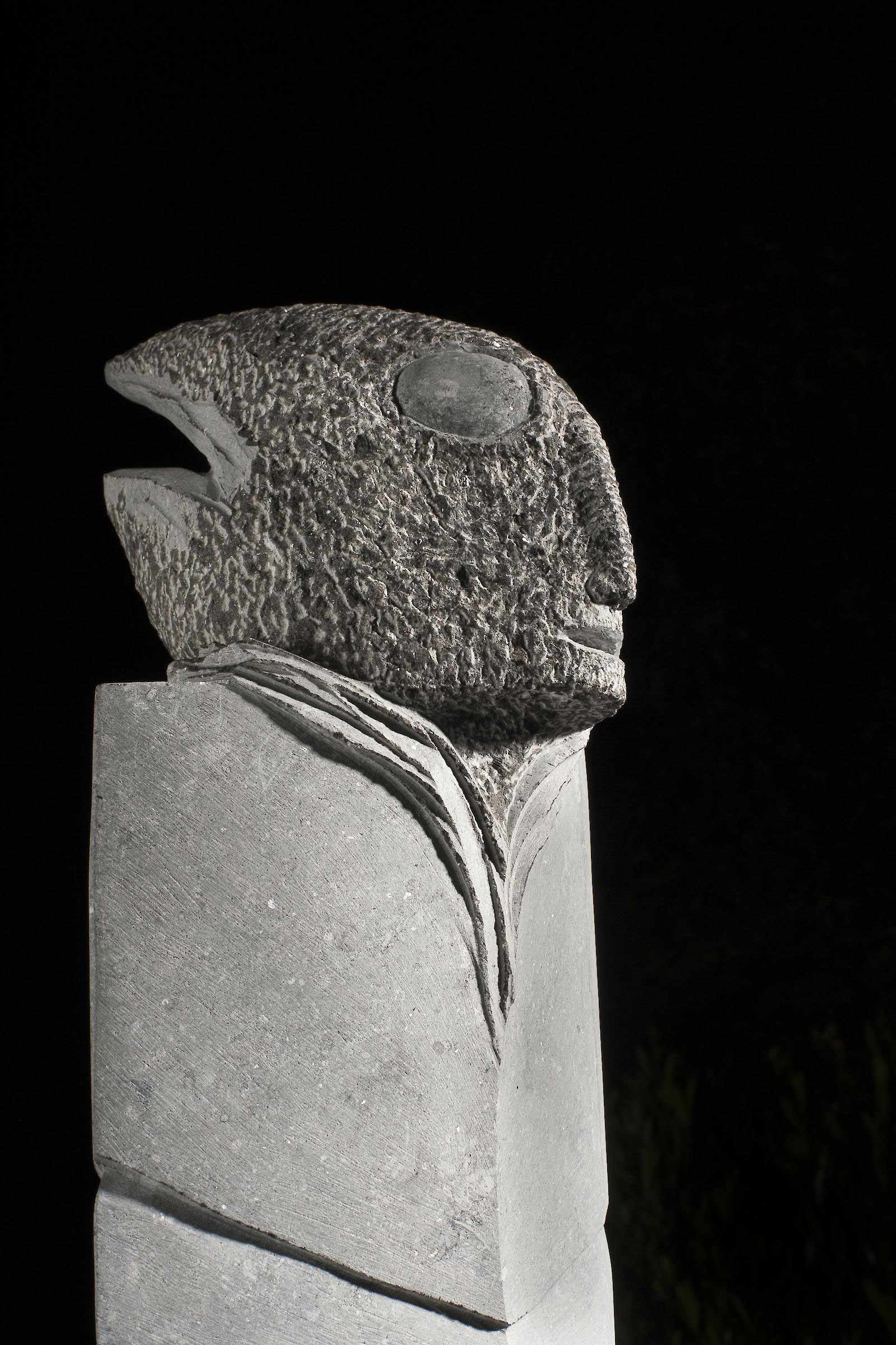 - Homme/poisson/volant, sculpture, calcaire de Massangis, quai de Montreux